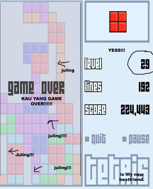 i got to level 29 the other day (YESSS!!). until my mata started going JULING and i made a mistake of fitting the bricks in to all of the wrong places. YATAH TU JULING. recently, i got to level 30…but my fingers couldnt reach the print screen button on time. hahaha.